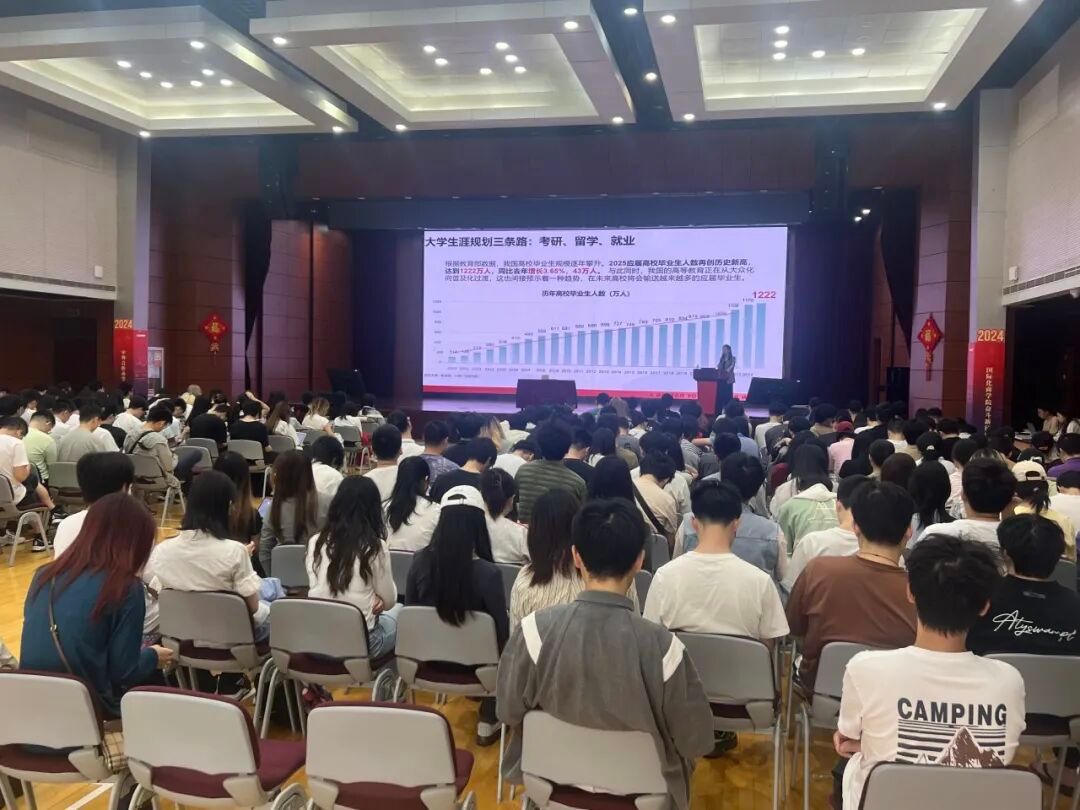 9月21日8:30,学院2023级本科生齐聚行健文体中心,参加由上海新东方前途出国就业力项目管理中心负责人李佳慧老师主讲的“Offer锁定攻略:毕业前最后一公里的留学/就业冲刺指南”讲座。讲座围绕大三保研、留学、就业三线选择解析、海外名校核心竞争力、企业招聘偏好、提升自身竞争力四大方面展开,有效强化了学生的生涯规划意识与素质提升认知。