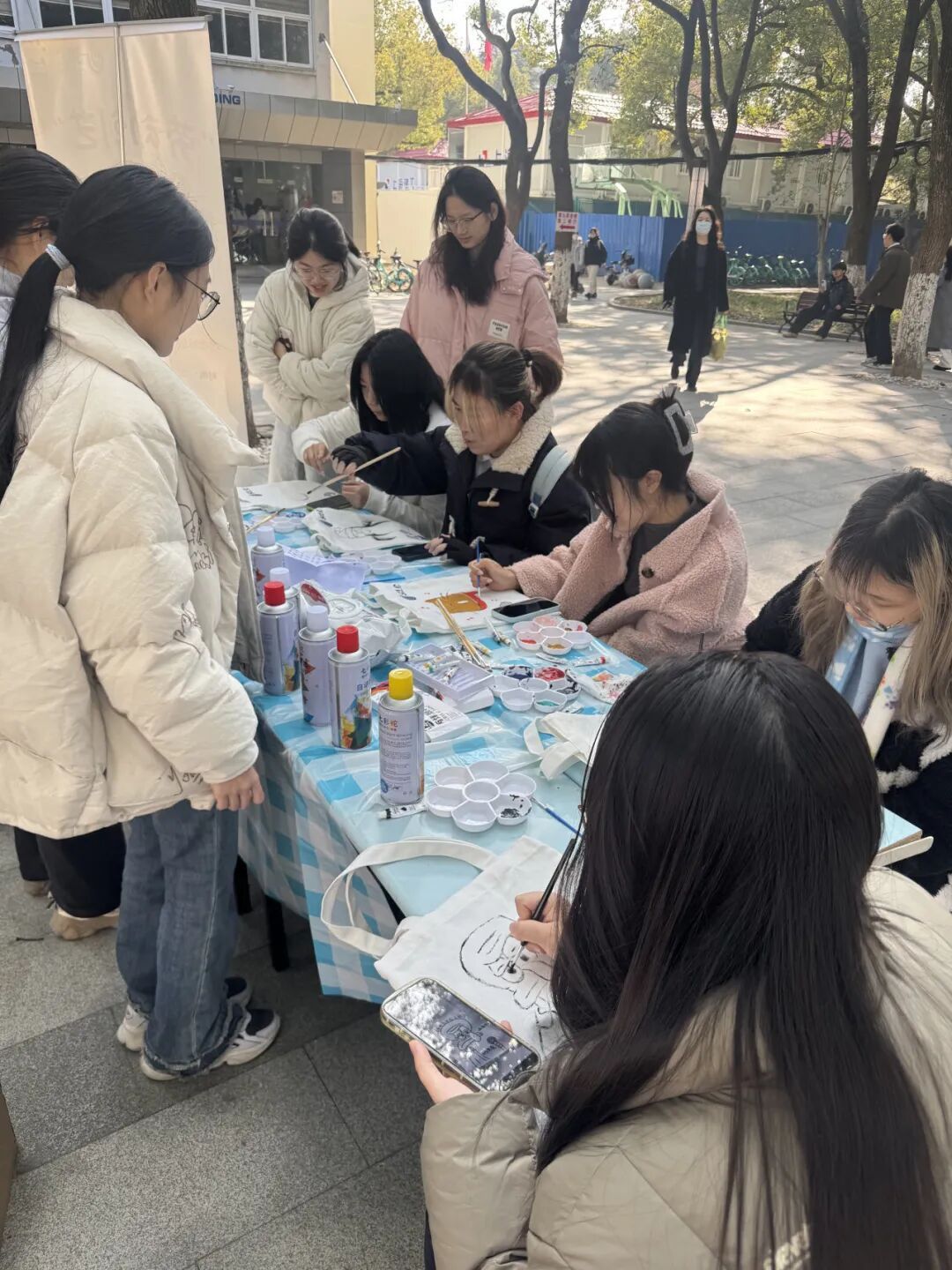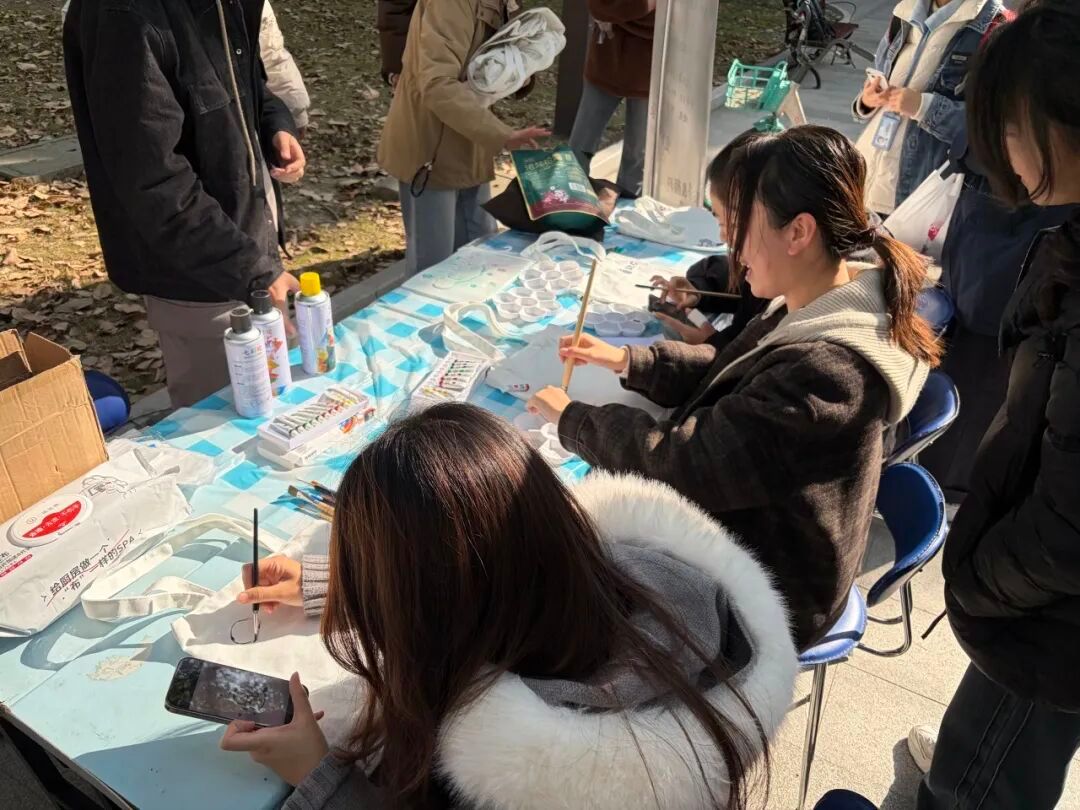 活动尚未正式开始,文荟广场的活动区就已布置妥当:醒目的“劳动创艺”主题展架立在一旁,展架上清晰标注着活动规则与物料清单。11:45活动启幕,同学们陆续抵达,现场瞬间热闹起来。DIY帆布袋的过程中,灵感与巧思悄然碰撞:大家或低头翻阅手机中预存的灵感素材,或侧身与身旁伙伴低语,交流构图与配色。待思路落定,画笔便循心而走。创作的间隙,技巧的切磋、创意的分享从未停歇,现场时不时欢声四起,处处洋溢着鲜活与温情。