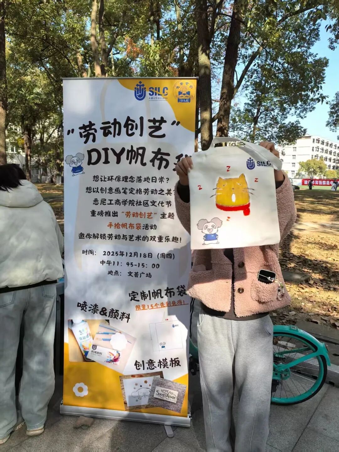 画笔流转间勾勒创意,色彩晕染中致敬劳动,上海大学悉尼工商学院社区文化节之“劳动创艺”DIY帆布袋活动,已于12月18日在文荟广场圆满落下帷幕。暖阳下的活动现场,同学们用巧思与双手,让空白帆布袋变成独一无二的艺术载体,也让劳动之美与环保理念在校园中鲜活绽放。